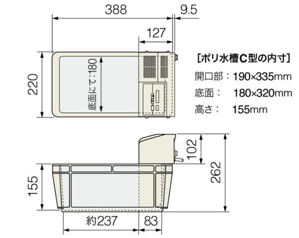 | 水槽内有効寸法 | 180×237×155Hmm 水槽内占有寸法:190×83×147Hmm |